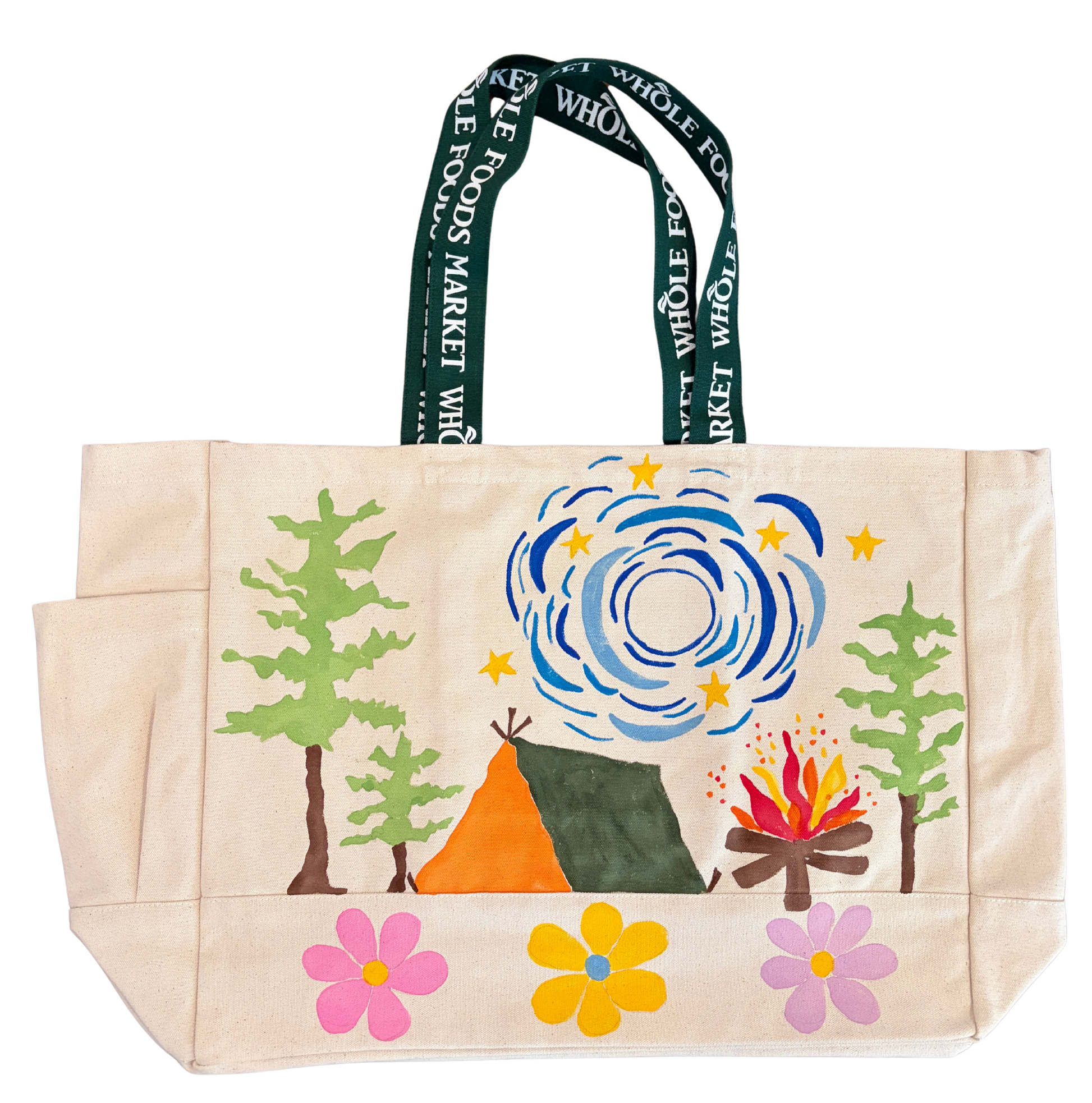 A night in the woods, captured in color. The Campfire Under the Stars Tote is hand painted with a glowing fire, pine trees, a tent tucked beneath a swirling evening sky, and scattered golden stars. Along the base, bright blooms add a playful contrast to the deep blues and greens above.