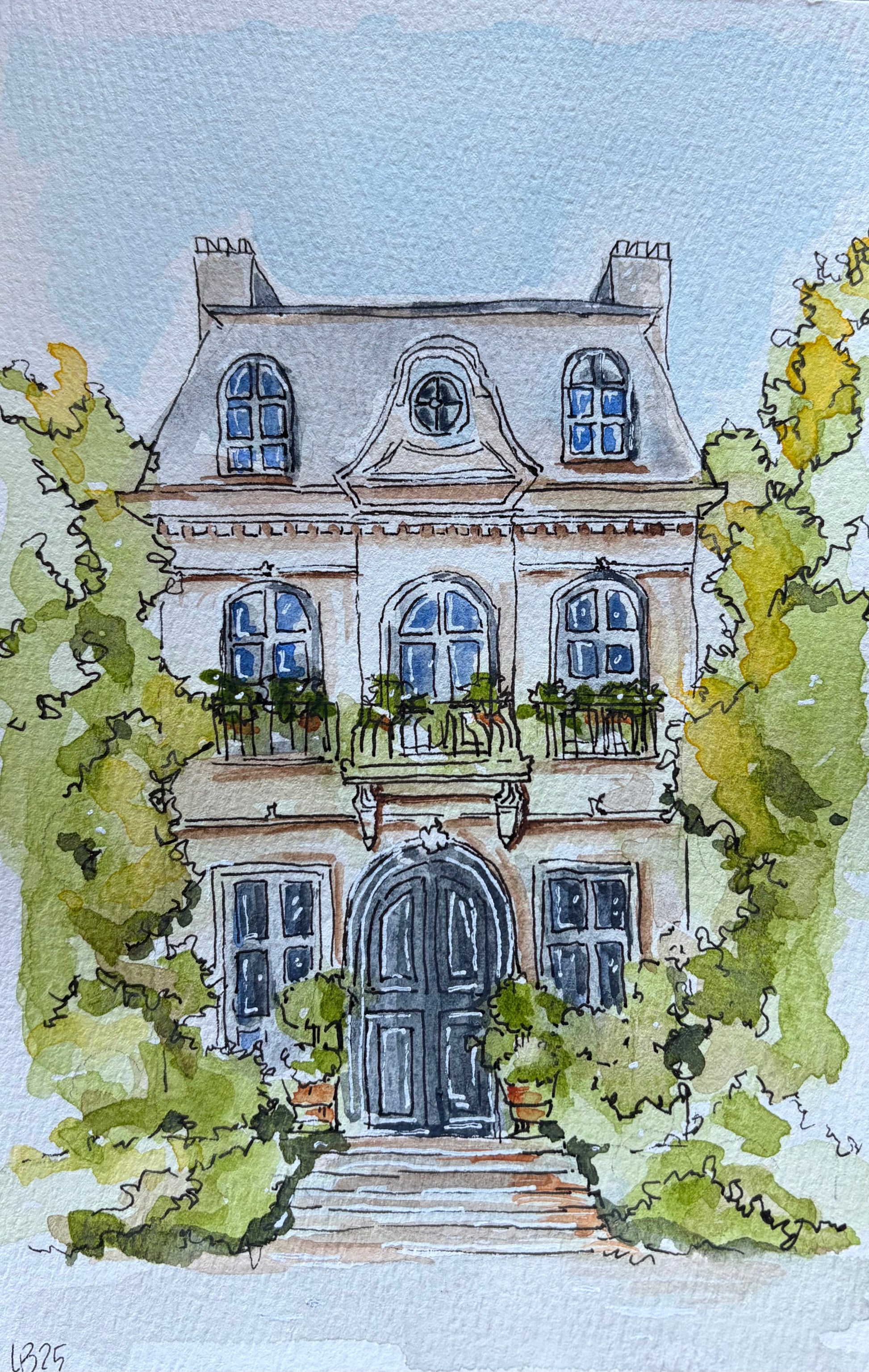 I spent a winter in France a few years ago to leave the cold in Wyoming and fell in love with the architecture in every village. Some small and simple, some large and full of details, but all full of scrumptious character. 5 x 8 original watercolor on paper, unframed.